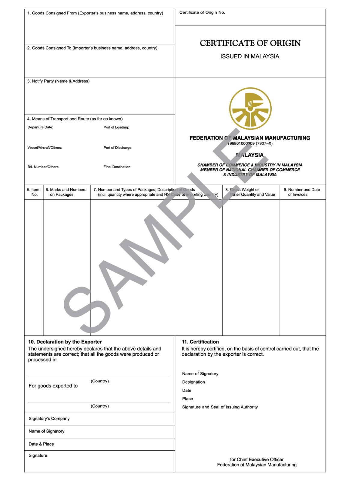 The FMM Non-Preferential Certificate of Origin (NPCO) forms are available for sale in